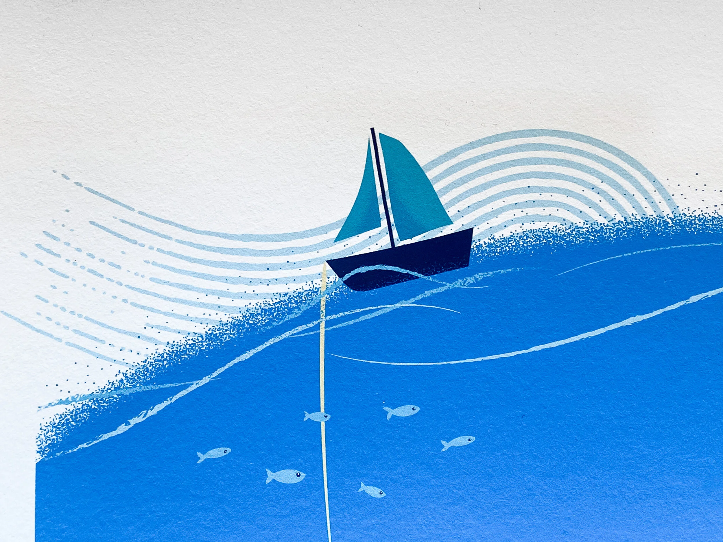 This was pure creative escapism. We accepted a special commission to create a poster with a nautical theme as a little boy’s birthday gift; an underwater scene offered the perfect sense of scale and wonder.